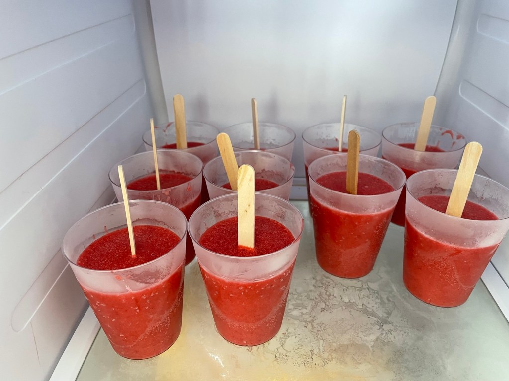 We found ourselves with a surfeit of strawberries, cause it’s that time of year. Add a little lemon syrup, coconut milk, banana, and yoghurt: hey presto… popsicles! We don’t have actual popsicle molds, and were disappointed that the $2 dollar shop didn’t either. But the plastic cups worked fine.