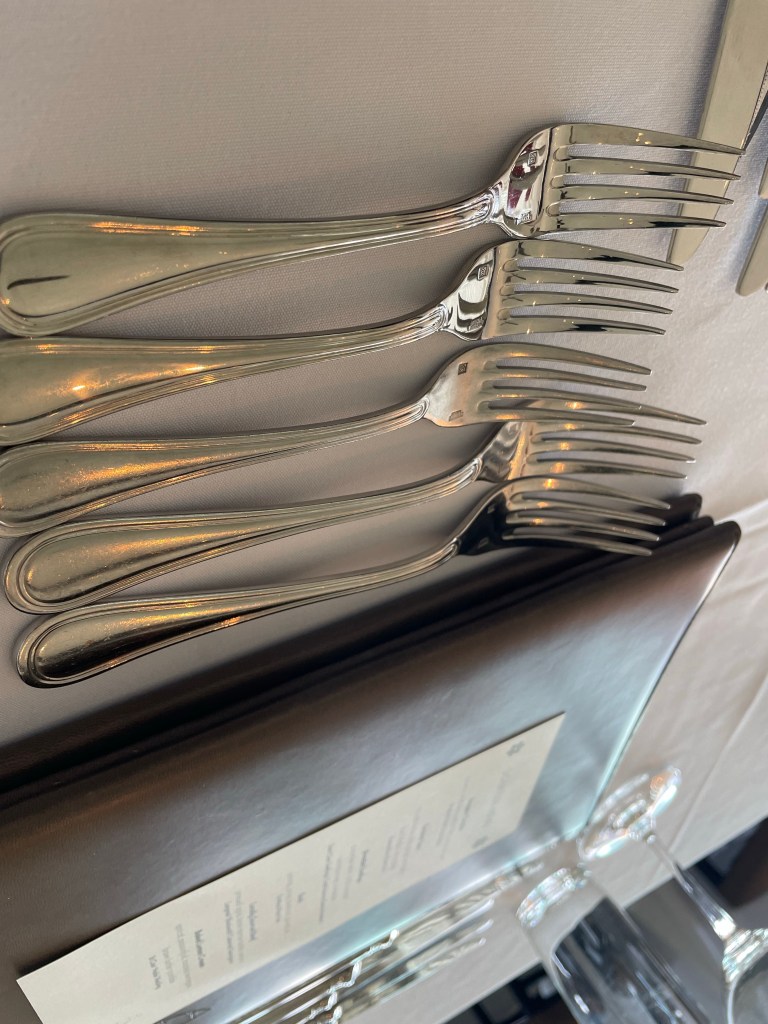 We had the 6-course tasting menu. When we got there the places were already set with five knives and forks. That was sorta cool but sorta over the top in my view. For what we were paying, couldn’t the server lay down new cutlery for each course? But restaurant service is a bit different in NZ… even in nice restaurants it’s common for cutlery and serviettes to be in a little box on the table and you grab your own.