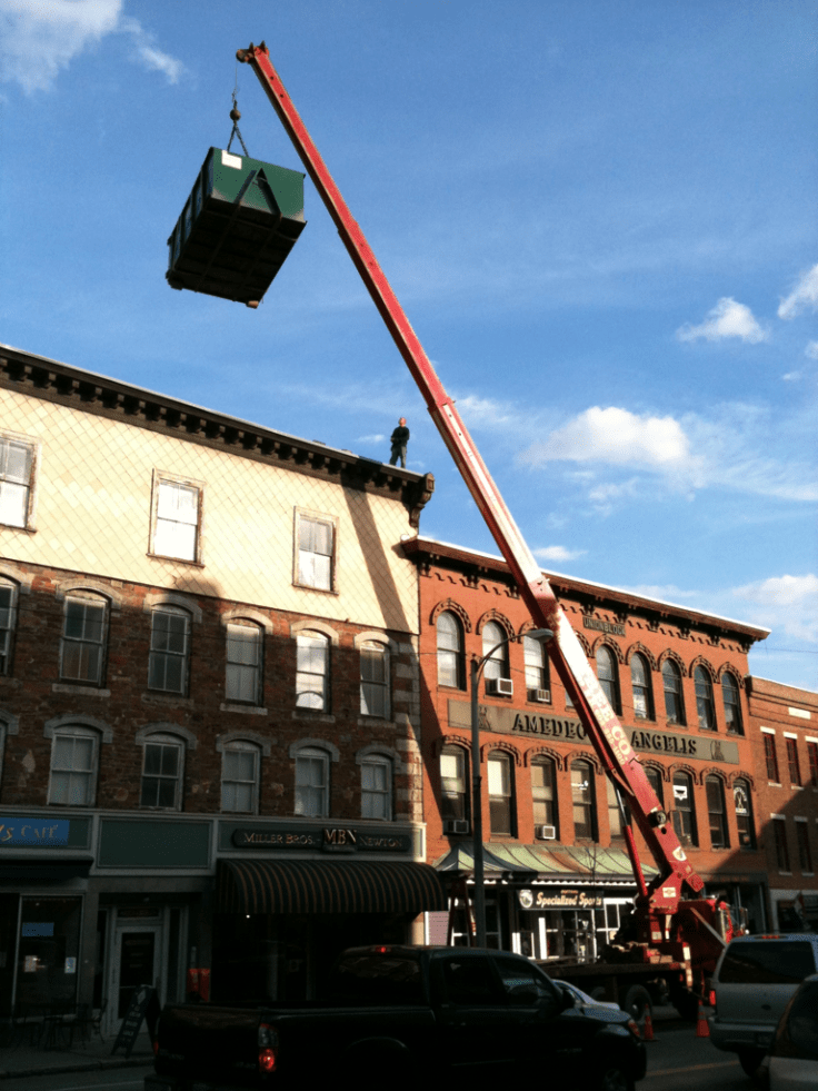 Today on our way back from our River Garden storage unit, we saw how non-tycoons do it. Three guys and some yellow tow straps, a giant dumpster and a logging crane… What could possibly go wrong?