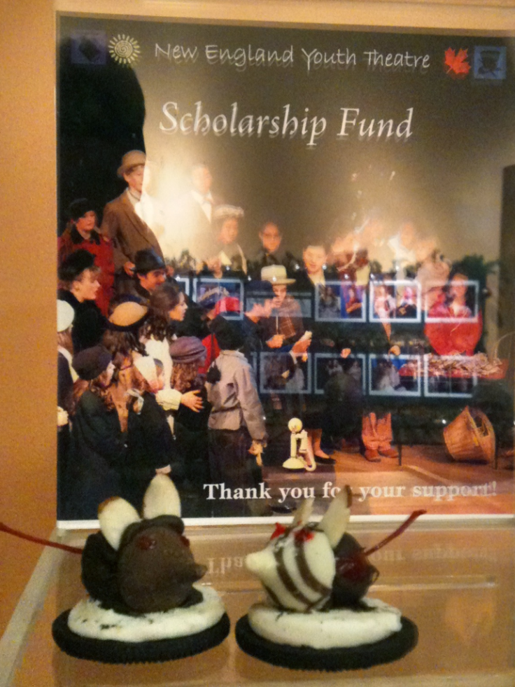 Tonight we are at New England Youth Theatre’s production of A Christmas Carol. At the lobby snack bar we got these MOST adorable cookies ever. Holiday magic sprung from half an Oreo, a Hershey’s kiss, a maraschino cherry dipped in chocolate and slivered almond ears.