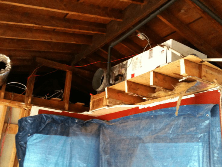 The air handling unit in the attic area will be relocated to the basement. It handles both A/C and can run as a backup to the radiant heat system. However, the restaurant’s layout meant that the unit itself, along with all its ductwork, was outside the heated space and probably burning a lot of unnecessary energy.
