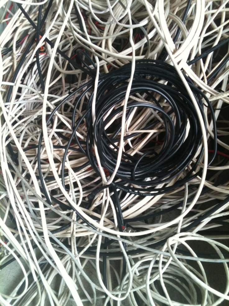The previous owner loved his wires. He had a security system with contacts at every door, cameras, etc. He had a satellite radio system with speakers in the ceiling… lots of them. He had cash registers, and phones, you name it. I ripped out a bunch of it so that we can put in things like outlets and light switches.