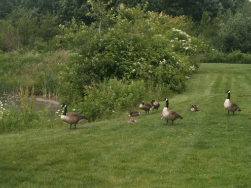 A family of geese hanging out in the Massachusetts sun whilst I paced around outside the hotel conference center doing that cell phone thing.