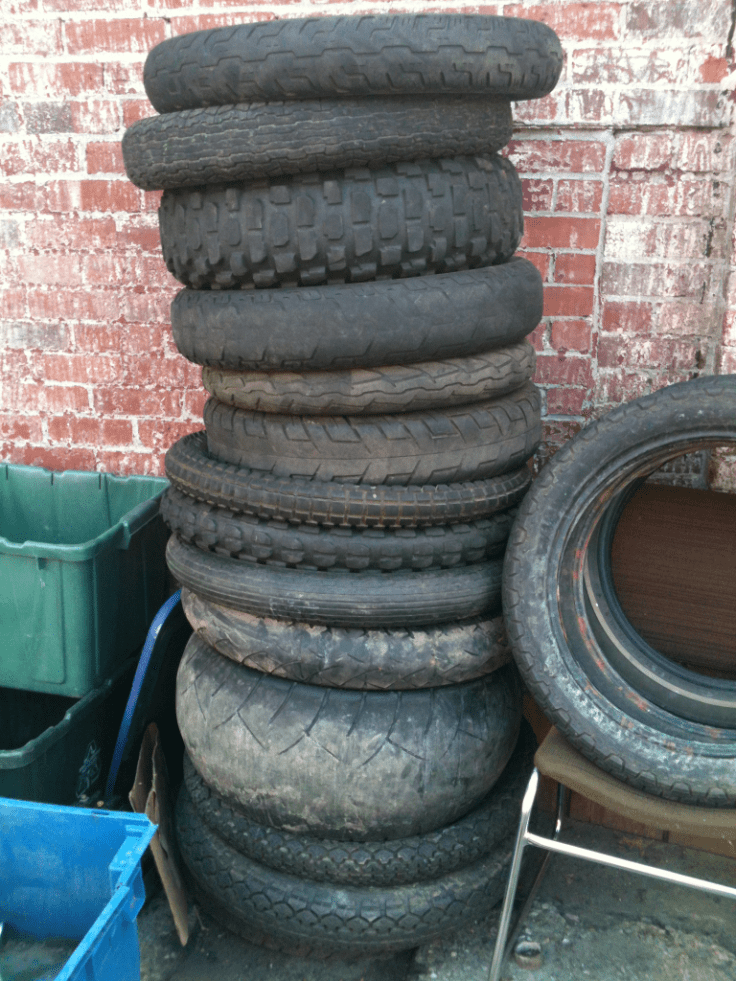 Outside Lynde Motorsports, where the wide variety of dead tires matches their eclectic portfolio of projects. The perfect motorcycle shop for here.