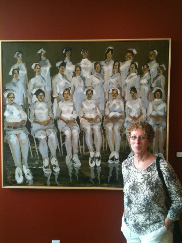 Lee posing with Frank Stout’s “Nursing School Graduates” in the lobby at Brattleboro Memorial Hospital. The combination of caps and mini-skirts lets us date this painting pretty precisely to the mid-70s. We first heard of Frank Stout earlier this year, unfortunately by reading his obituary.