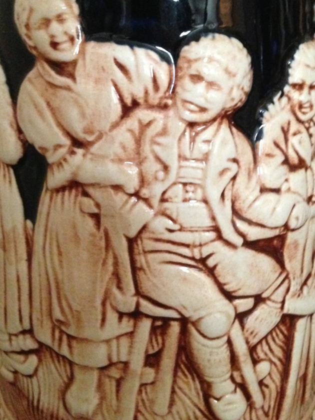 I’m staying in a bed-and-breakfast this week. The decor is predictable, flowered wallpaper, bigger flowers on the drapes, 18th-century engravings on the wall. Packing up this morning, I happened to actually notice for the first time the giant beer stein on the dresser. It’s the Joker!