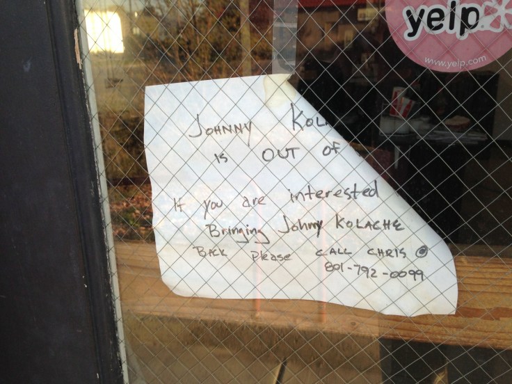 This is the sad sign on the door of the former Johnny Kolache’s. I was one of the very first people to write my name in magic marker on the wall.