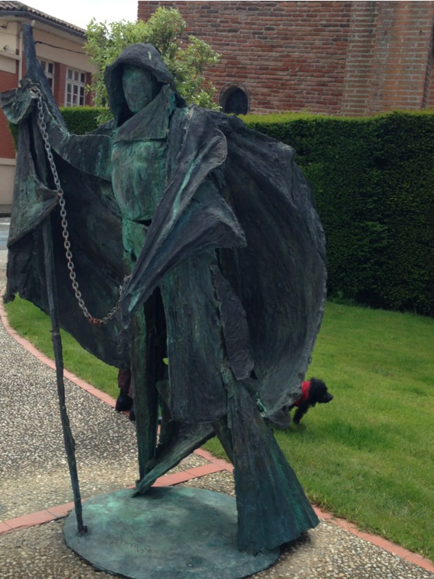 We were drawn to this dramatic sculpture in Castelsarrasin, and just as I was lining up the shot a lady comes along (completely hidden here) so little Milou can do his business. As often, the shot is much better for that surprise.