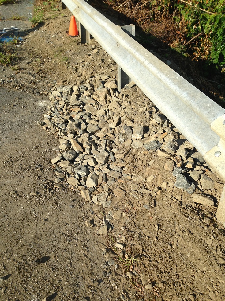 So, following the gullywasher, we were pleased to see first an orange cone that sprouted up overnight like a mushroom. Then came a dump truck and an excavator. They poured a whole truckload of gravel into the void. Now we’ll have a nice big ice dam come winter.