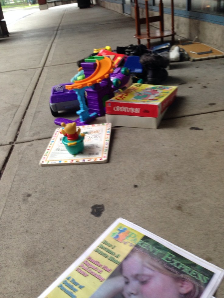 Today’s offering was particularly poignant, a copy of a free tabloid called “Parent Express” and a scattering of discarded kids toys.