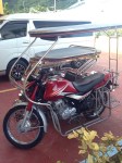 These awesome little bikes are everywhere here, serving as informal taxis. They are either a 100 cc or a 175 cc motorcycle, with this amazing sidecar, all done up in chrome, and as far as I can tell all custom designed, They can carry anywhere from 1 person riding sidesaddle behind the driver or comfortably in the sidecar, to as many as six or seven, including children, and usually groceries, etc.