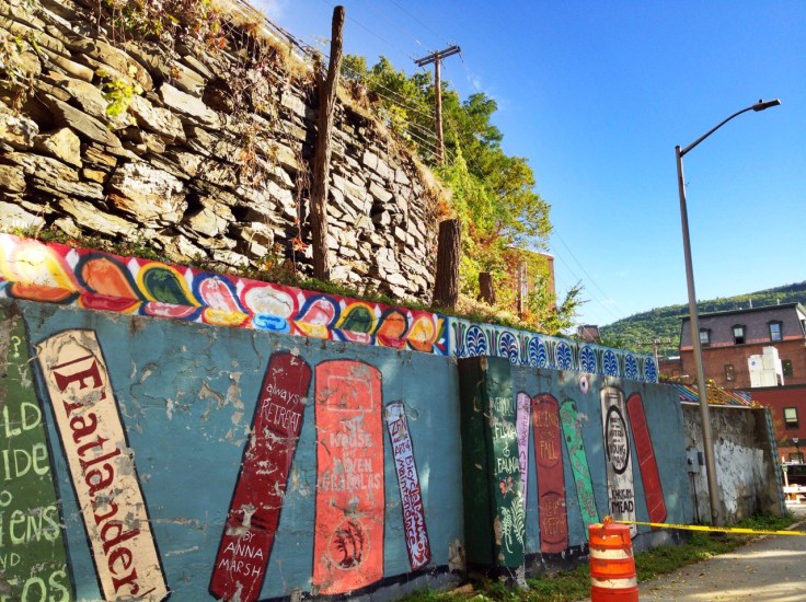 The Harmony Parking Lot was developed with great optimism in the 1980s. The murals along the concrete base of the retaining wall are now faded and peeling, but still humorous…