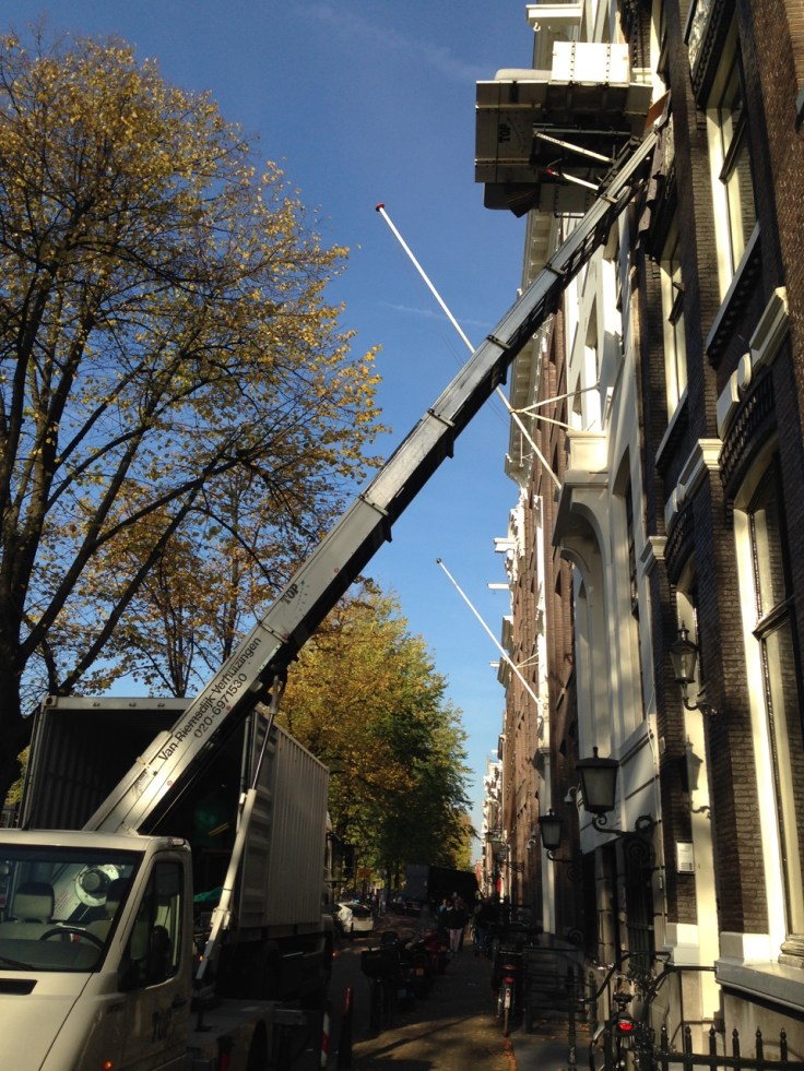 How do you get your futon up to the fourth floor? Many of the old buildings are equipped with over hanging hooks or pulleys, and we’ve seen people throw a rope around and hoist furniture, but it’s easier if you have a ladder lift truck.