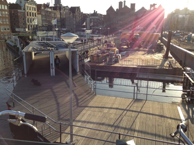 To the right of the frame, there’s a big repaving project going on. So, how do you detour the pedestrians? Answer: build a floating walkway in the canal.