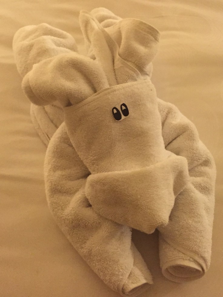 Towel sculpture was one of the many little touches at the hotel in Jakarta. Perhaps too many little touches for my taste: walking across the lobby elicited 3-6 cheerful “hello, sirs” complete with little namaste-style bows. The chef who personally supervised the preparation of my omelette came to present his regards at such length that said omelette was kinda cold by the time I was able to eat it. Such eagerness for my stay to be perfect! I did have to put my own sugar in coffee, but milk was handled by a dedicated team in the service area.