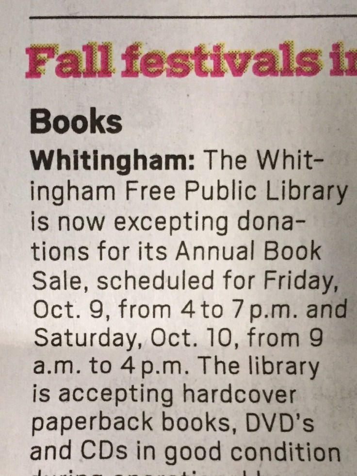 Maybe if the Whitingham Library did something with the books besides sell them, the world’s newspapers would find it easier to hire people who know the difference between except and accept.