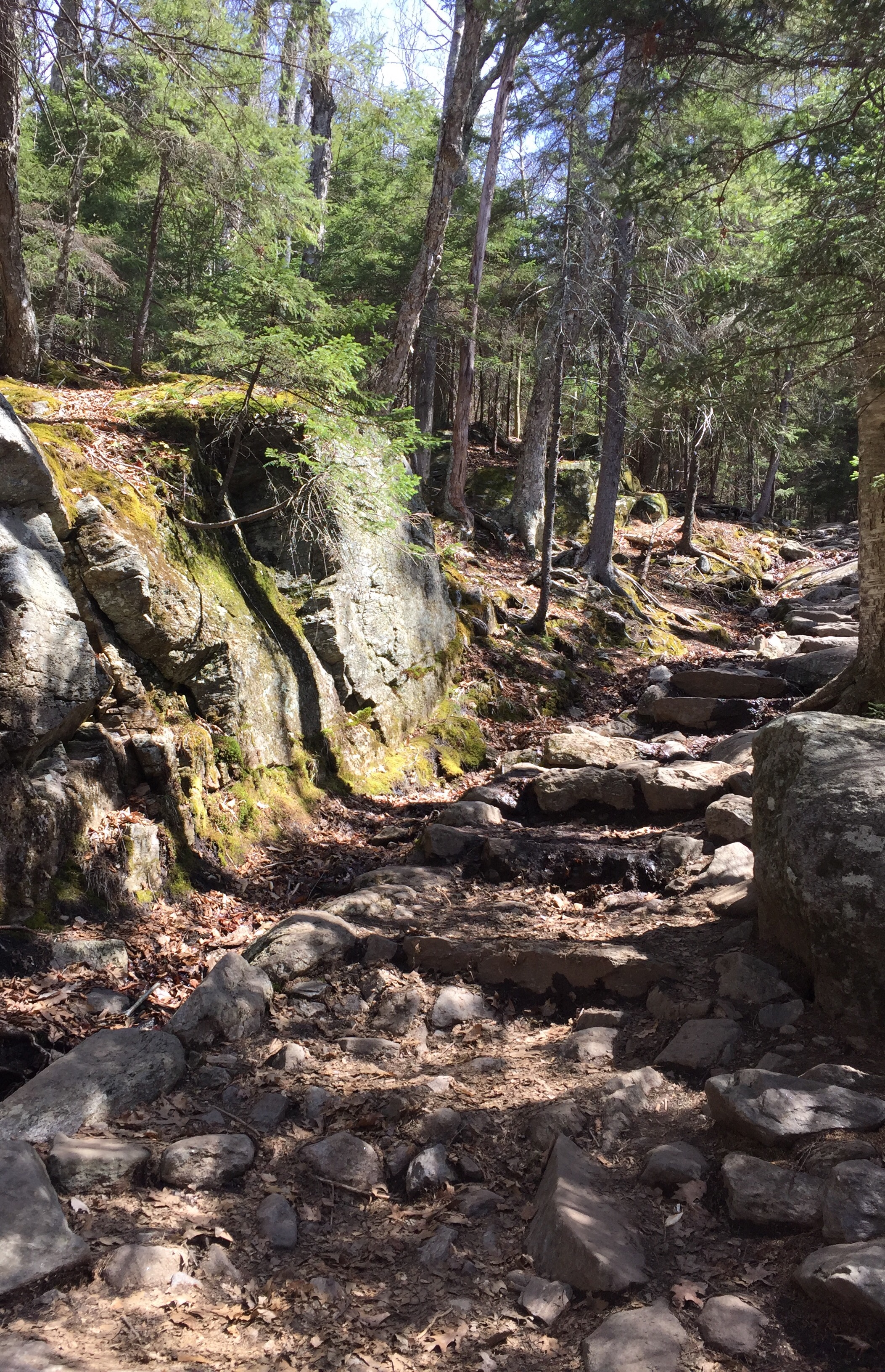 The trail starts out with an easy walk up a dirt road, then turns to forest trail and gets increasingly rocky.