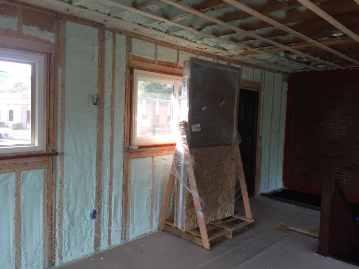 Now, week 4, we got the insulation done on Monday, and drywall is under way. The new front door arrived, and the light fixtures are all picked out. It’s definitely moving along.