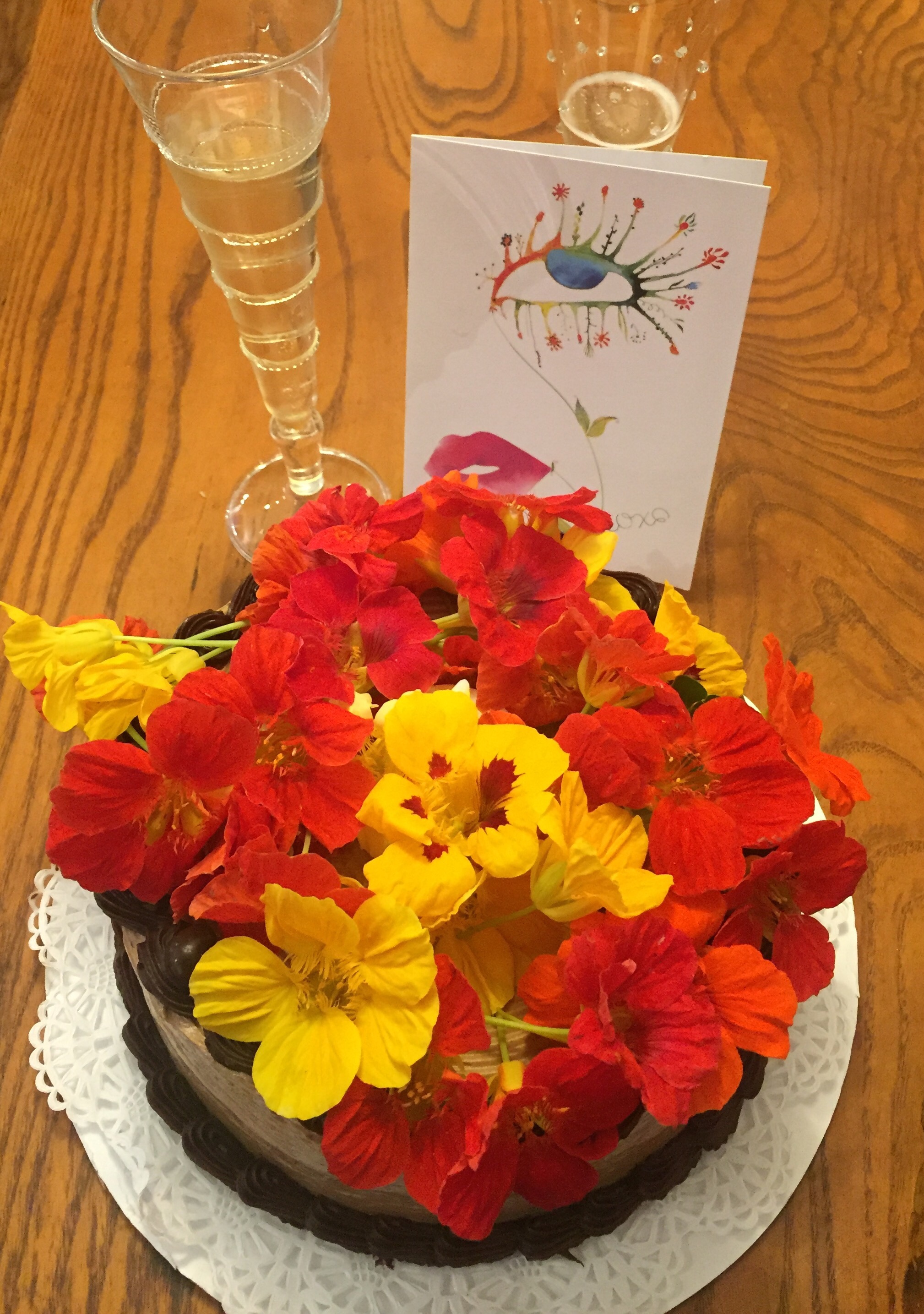Birthday week continues with a beautiful cake from Amy’s and an effulgence of homegrown nasturtiums. They are more peppery than we realized, especially the stems, but somehow it worked with the cake anyway.