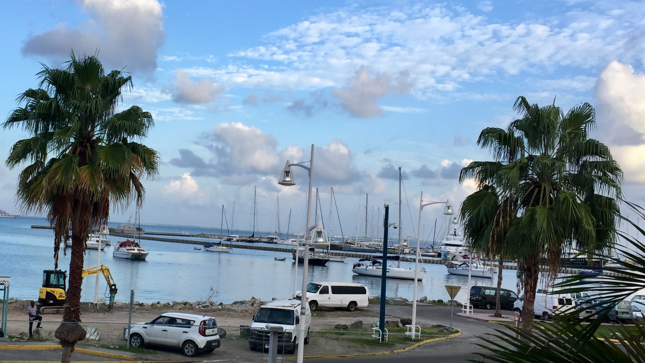 Here’s what we look at from the dining table. As advertised, we’re right on the main road, but the view over the marina is maybe better than expected.