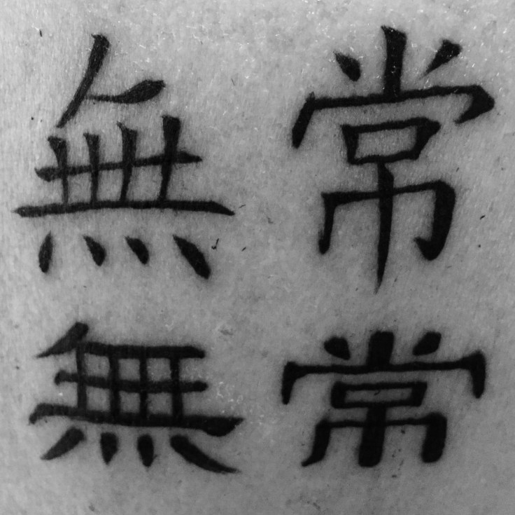 The characters say “unpredictable change is the only thing that lasts forever.” Unless somebody was duped… for all I know it says something like “foolish tourist.”