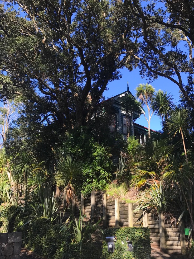 Walked to the La Cigale market for fresh veggies. Our route takes down a couple pretty streets and through a park that includes a tiny little tropical rain forest. My photo skills are challenged when I try to capture the lush oversized greenery. Here’s a house perched on a hill overlooking that little park.