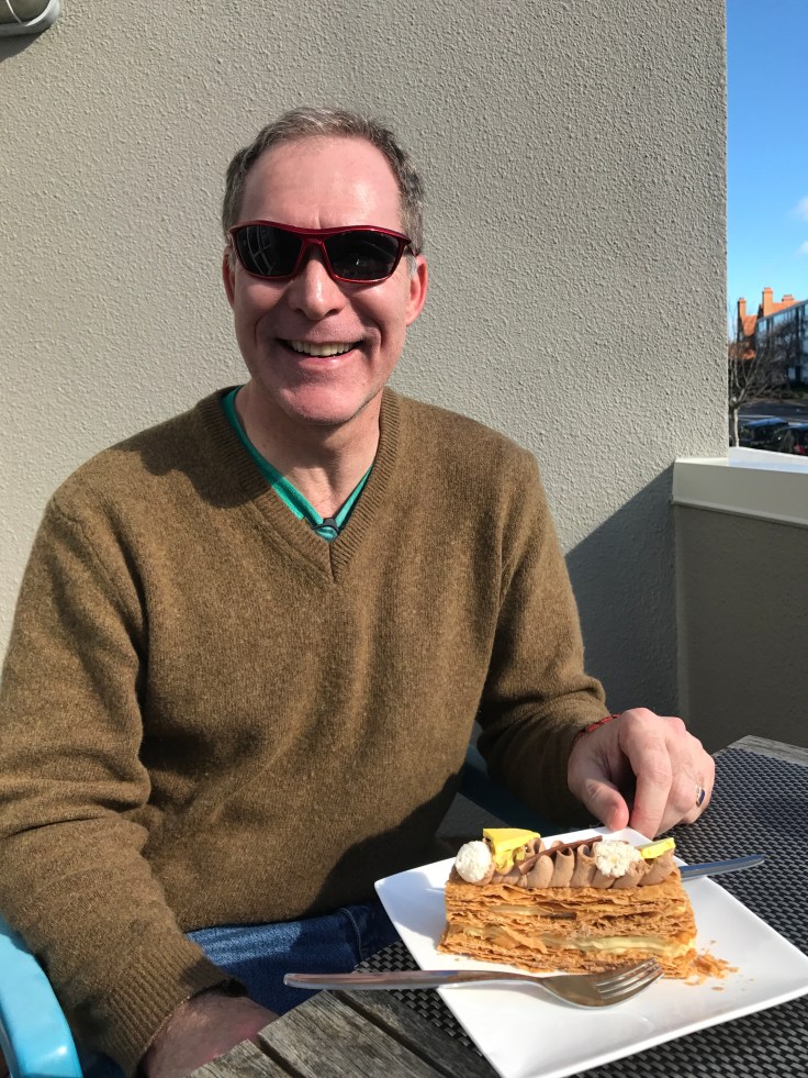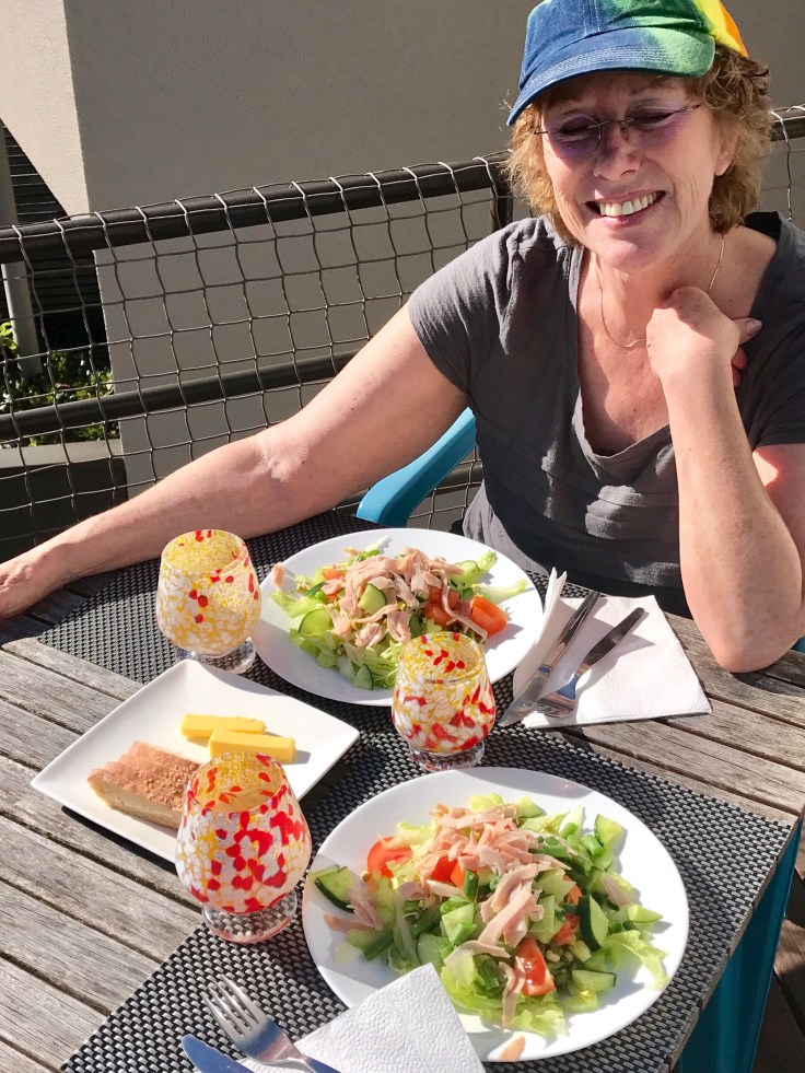 We turned some of our new veggies into a salade kiwoise, added a lovely French pastry (Bastille Day and all) and had a midwinter picnic lunch on our little balcony.