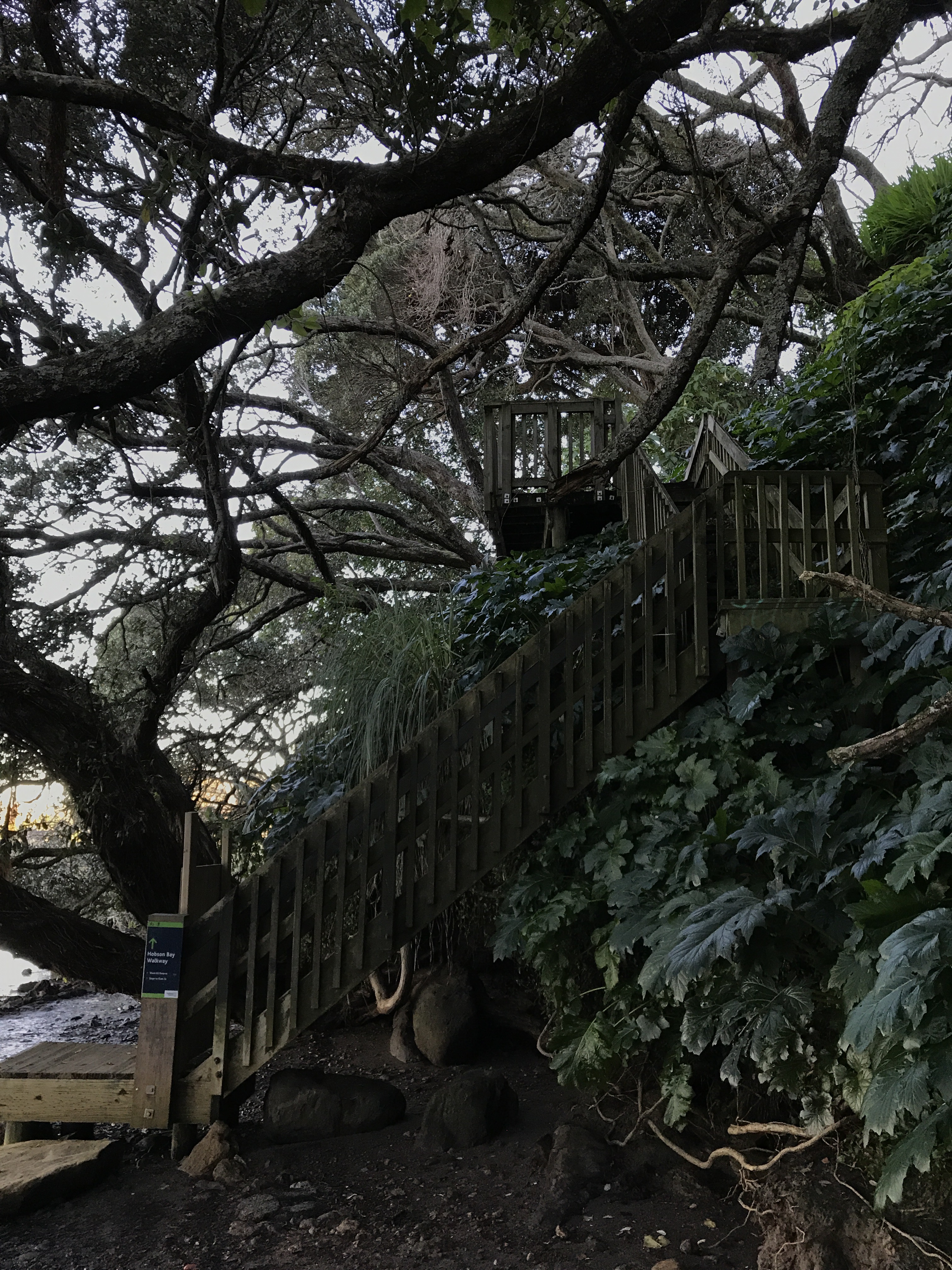 After returning the car today, we took a walk down to the water, where the Hobson Bay Walkway meanders along for miles and miles. The bluff is steep, and they’ve built nice stairs to get you down there.