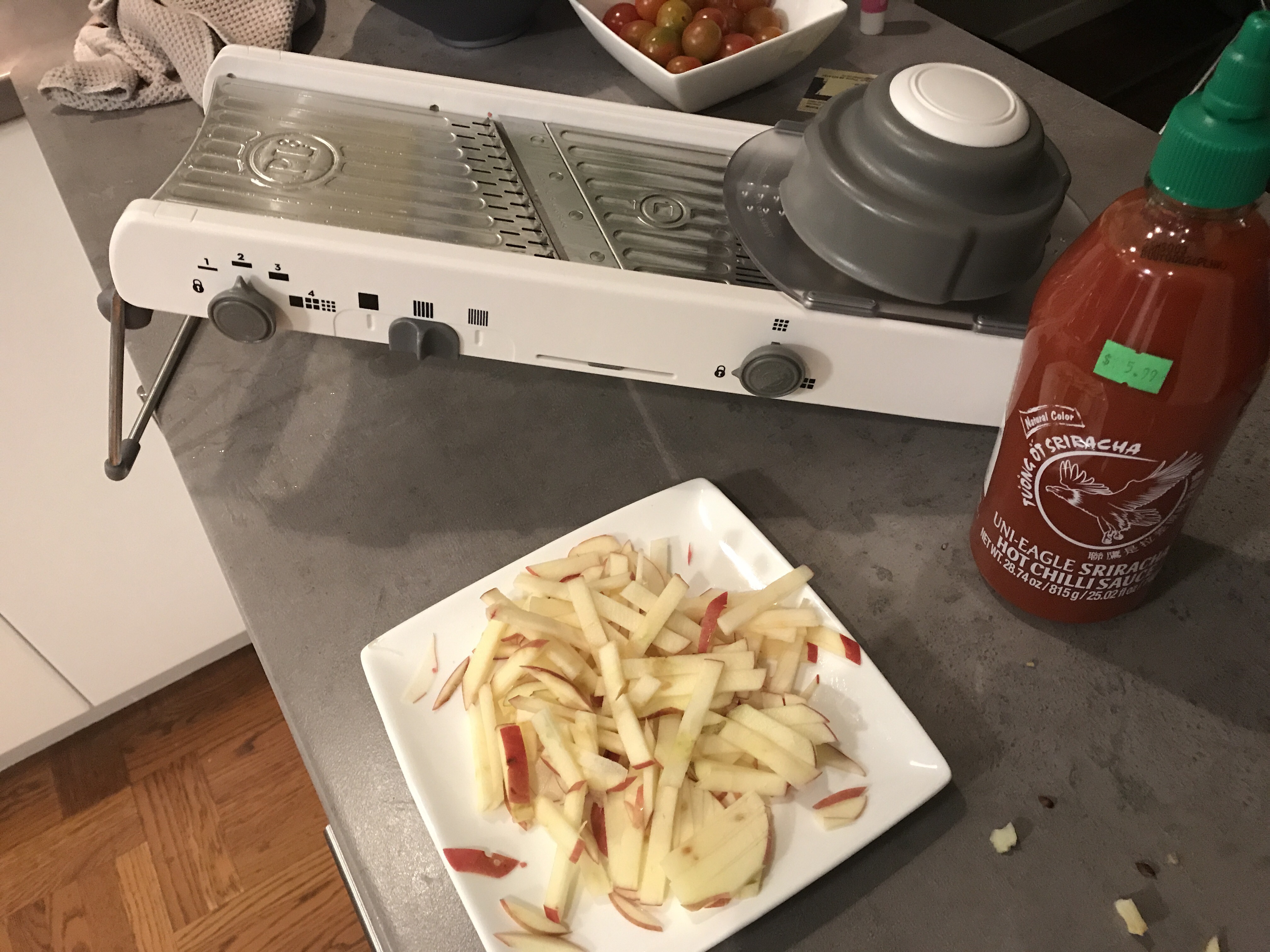 We had a fun day last weekend, including a lot of shopping. Apples and cherry tomatoes from the farmers market, a super-nice mandoline from a fancy kitchen store, and – finally – a bottle of sriracha from the Asian grocery.