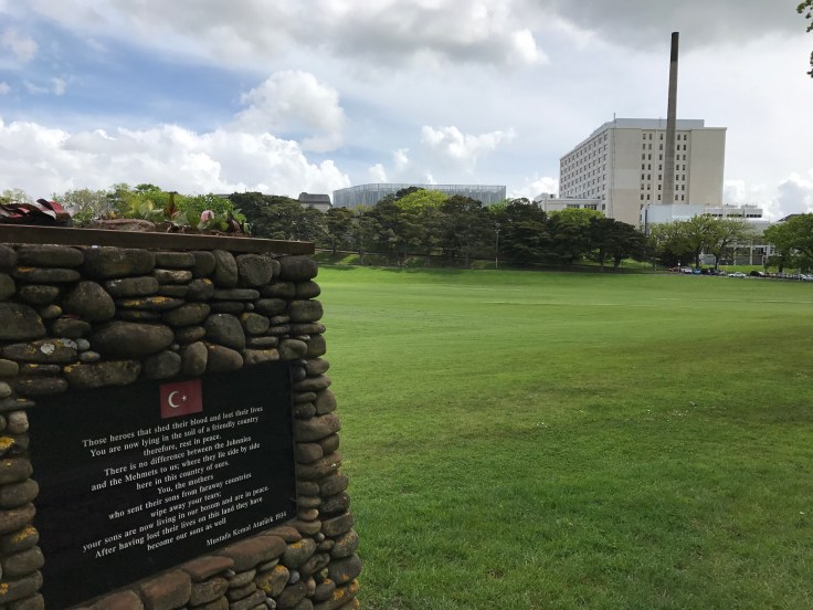 On the back of the memorial, with Auckland Hospital in the background, there’s a lovely quote from Ataturk about how all the dead boys buried at Gallipoli are the same, whether Johnny or Mehmet.