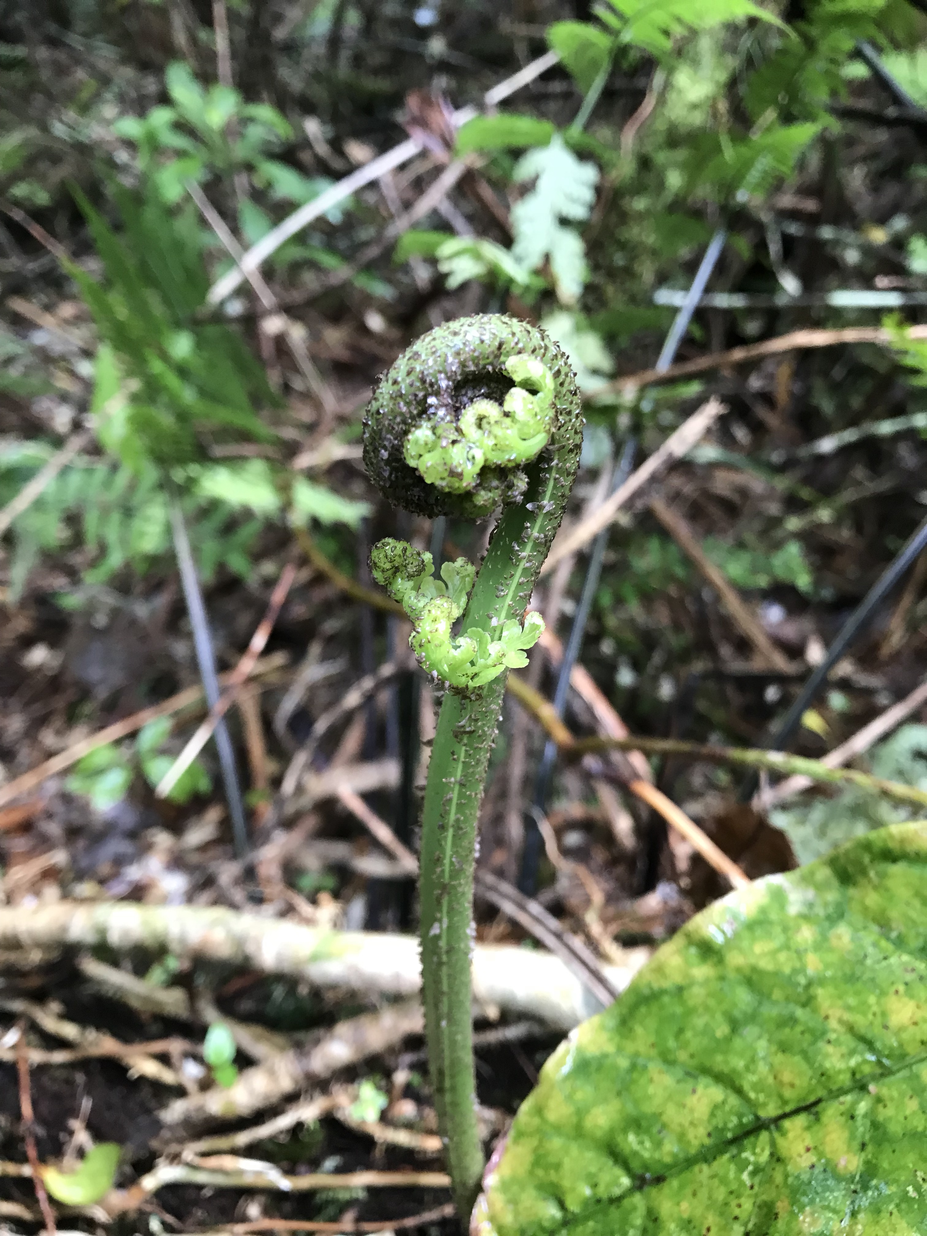 Joni is looking at a fern known locally as hen and chicks, which makes fiddleheads that are apparently good to eat and definitely pretty…