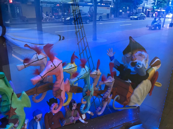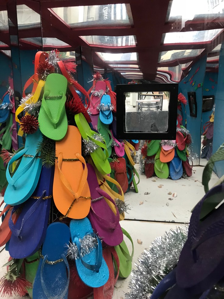These big baubles were scattered around as were a few giant wrapped presents. But inside the presents were little vignettes of Kiwi Christmas. Like a whole tree of jandals… flip-flops to you and me.