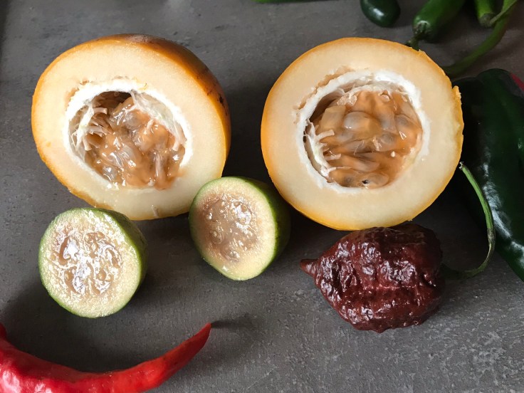 We went to La Cigale market yesterday and ended up with a bag of feijoas (the little green ones), Brazilian passionfruit, and a mixed bag of hot peppers.