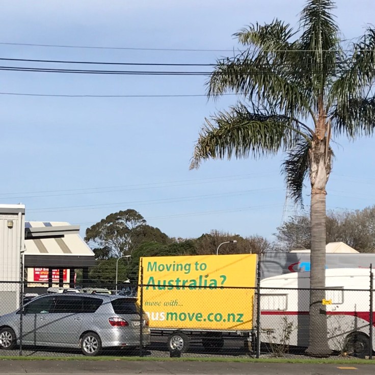 We saw this billboard in the parking lot at a self-storage place. We think NZ is sort of an Elysium, but lots of people who grew up here see Australia as even better. There’s just more there there, salaries are often higher, kangaroos, and so on.