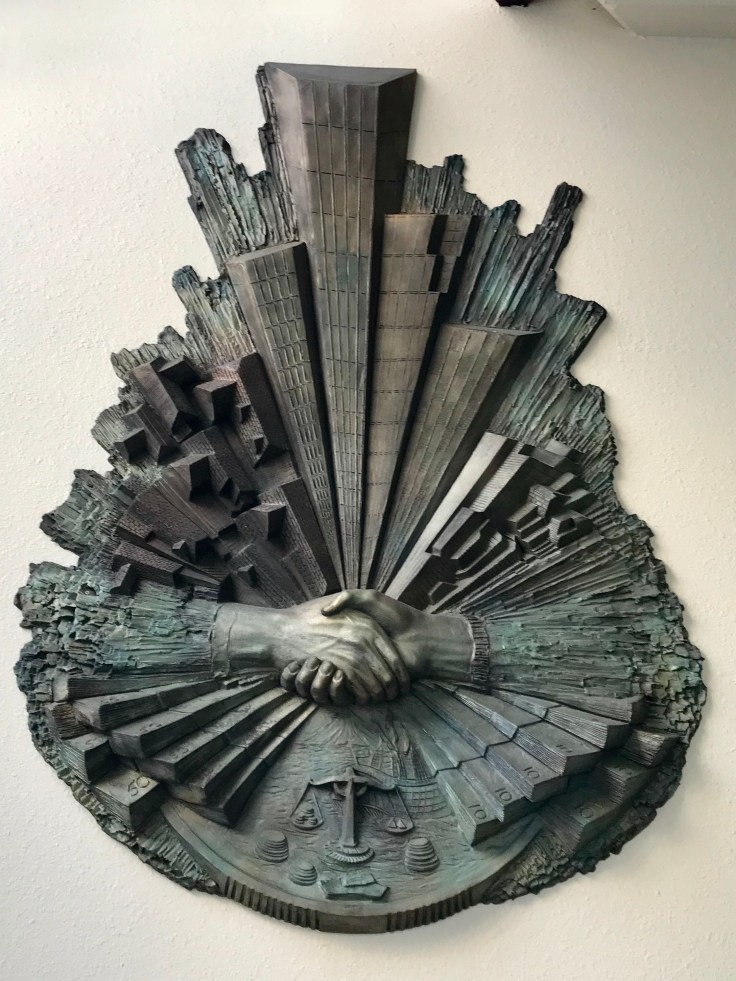 This plaque sits in the entryway of a nondescript building in Newmarket that I walk by every day. It’s quite high on the wall, not very noticeable in the scheme of things. But it has a solid Ayn Rand vibe, I think, strong-handshake men building a city out of nothing, with a little gold changing hands down at the bottom.