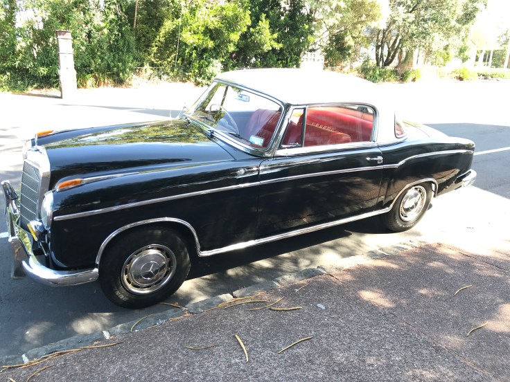 That, my friends, is a 1958 Mercedes 220S. It’s a nice-looking car, a model I didn’t know, and it happened to be parked up the street last weekend. We would look very fine, I said to Lee, driving down the road in a car like that.