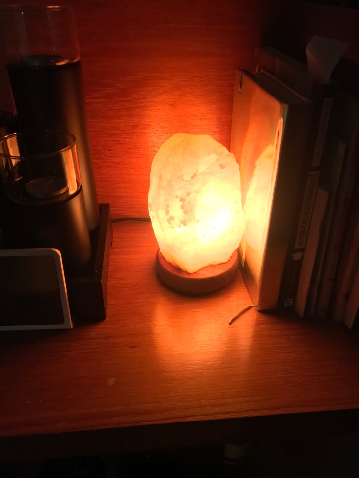 So far, we have to concur with this nice article about the actual value of having a salt lamp… it hasn’t cured any ailments yet but it’s a nice light in the early morning or late evening… and it totally keeps the books from falling over.
