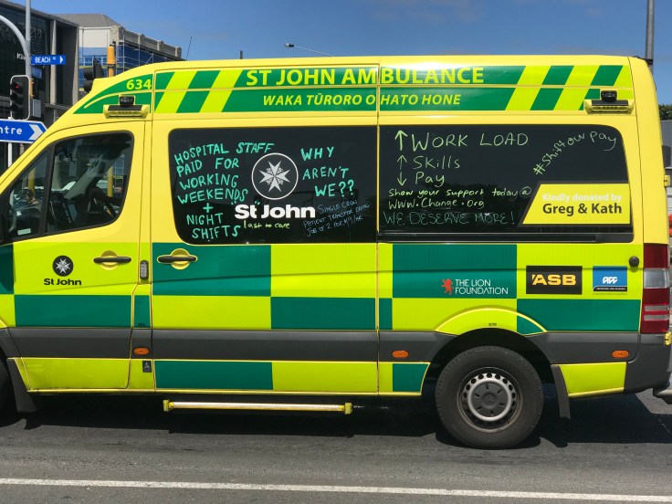 This ambulance is advertising its driver’s (or at least some driver’s) opinions as it rolls along. If they’re really not getting any night /weekend pay I have to agree that’s no good… seems like everybody in healthcare gets something extra for the off-hours work they do.