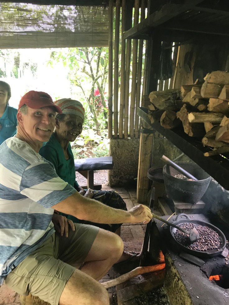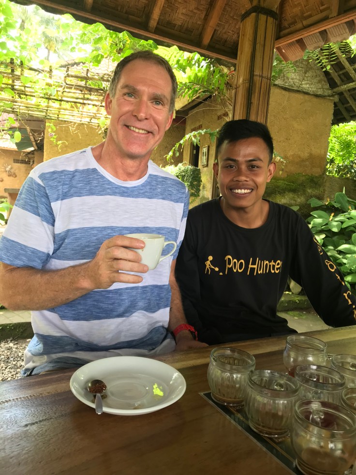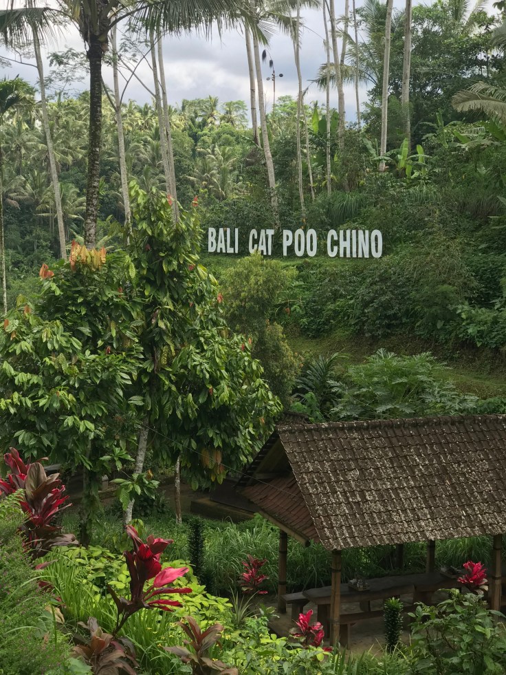 Lee hadn’t seen a coffee plantation, and Chuck and I were both willing to do it again, so Kadek took us to one. See, said the guy who showed us around, like the Hollywood sign!!