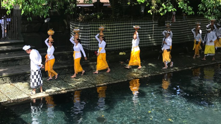 The Balinese Hindu calendar seems to be neither lunar nor solar according to the explanations we got. There are ceremonies and rituals at odd intervals, and then more that happen for births, deaths, marriages, and so on. There’s a good time to start a business, a good time to get engaged, and so on. So with all that complexity, we had no idea what the big procession we witnessed was all about… but it was pretty impressive!