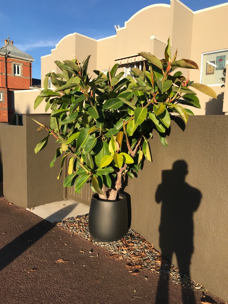 The rubber tree continues to thrive. It was part of that first big load of plants we bought, potted in an old washing machine tub.