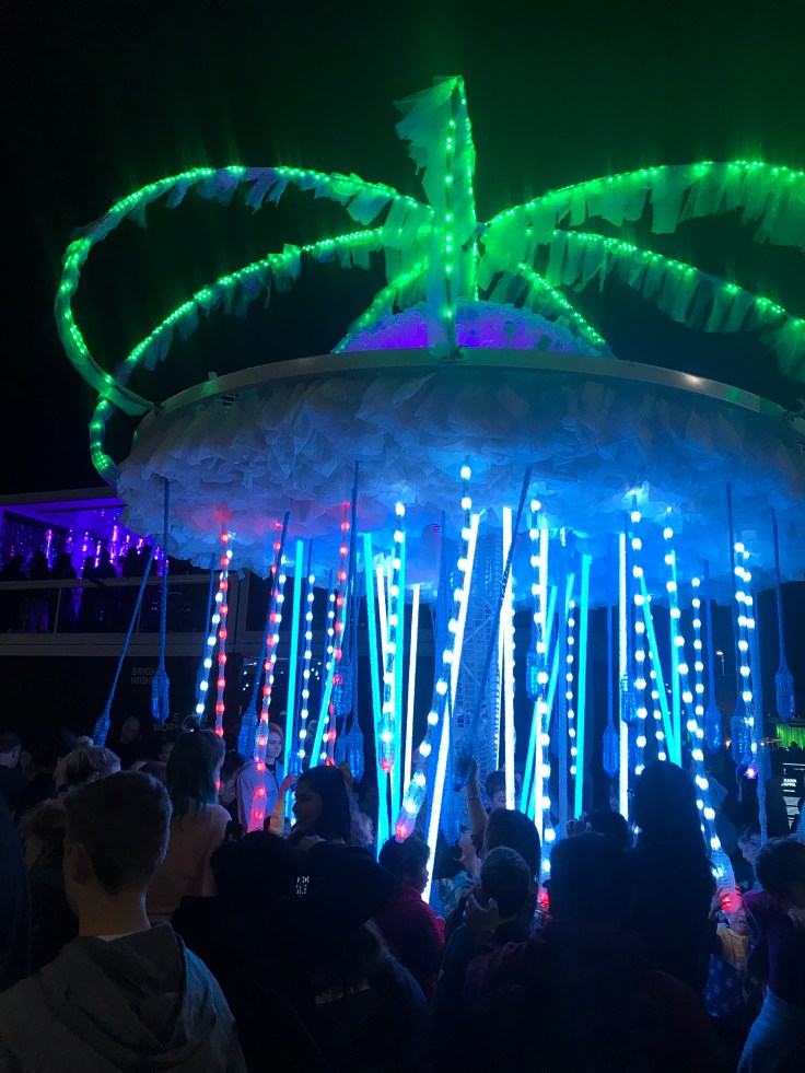 That’s a person in a lighted costume up above, who did a mesmerizing fairy dance that even managed to make lots of high fives look elegant and mysterious.