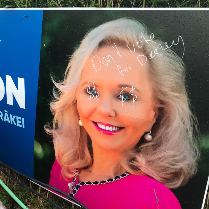 Desley Simpson, who looks quite a bit older in person, has plastered her campaign picture all over town. Defacing things is bad, but the observation that she is the voice of big money is not unreasonable. She really always wears things in that pink color.