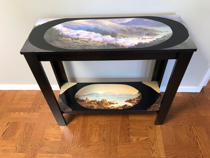 Lee has been doing a bunch of artsy projects lately. Here’s the newest. She took this hall table we picked up online, painted it, then applied the two old prints, found somewhat damaged at an op shop, using trusty Mod Podge.