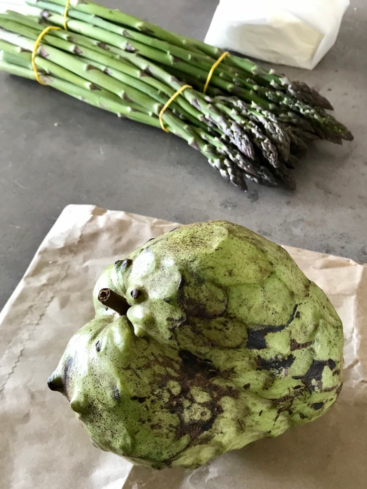 Saturday’s unexpected find at the farmers market: a cherimoya or custard apple at the honey lady’s stand.