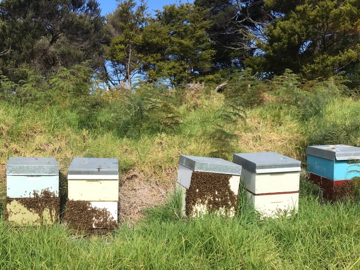 At Tawapou farm in Tutukaka where we’re enjoying a couple nights with Tom and Isabella. Honeybees hanging out on the hive in an attempt to keep the interior cool is known as ‘bearding’.