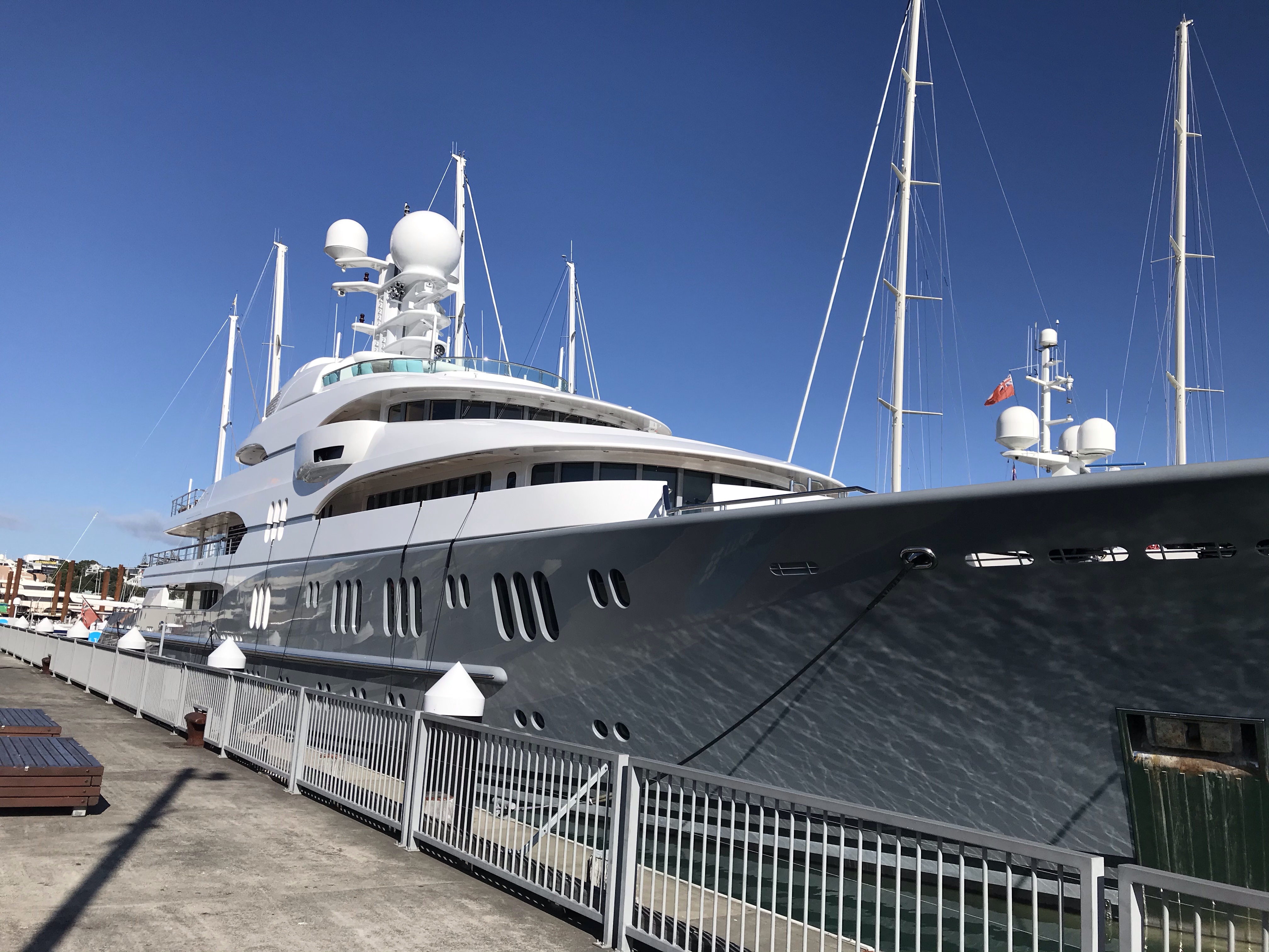 This one is the Rocinante, which is according to one source the 122nd largest yacht in the world, reportedly owned by a Spanish billionaire. I heard people inside laughing loudly… probably the crew. While I don’t imagine many super yacht owners are suffering greatly during the pandemic, this crew at least ended up in a Comccomfortable spot for quarantine.