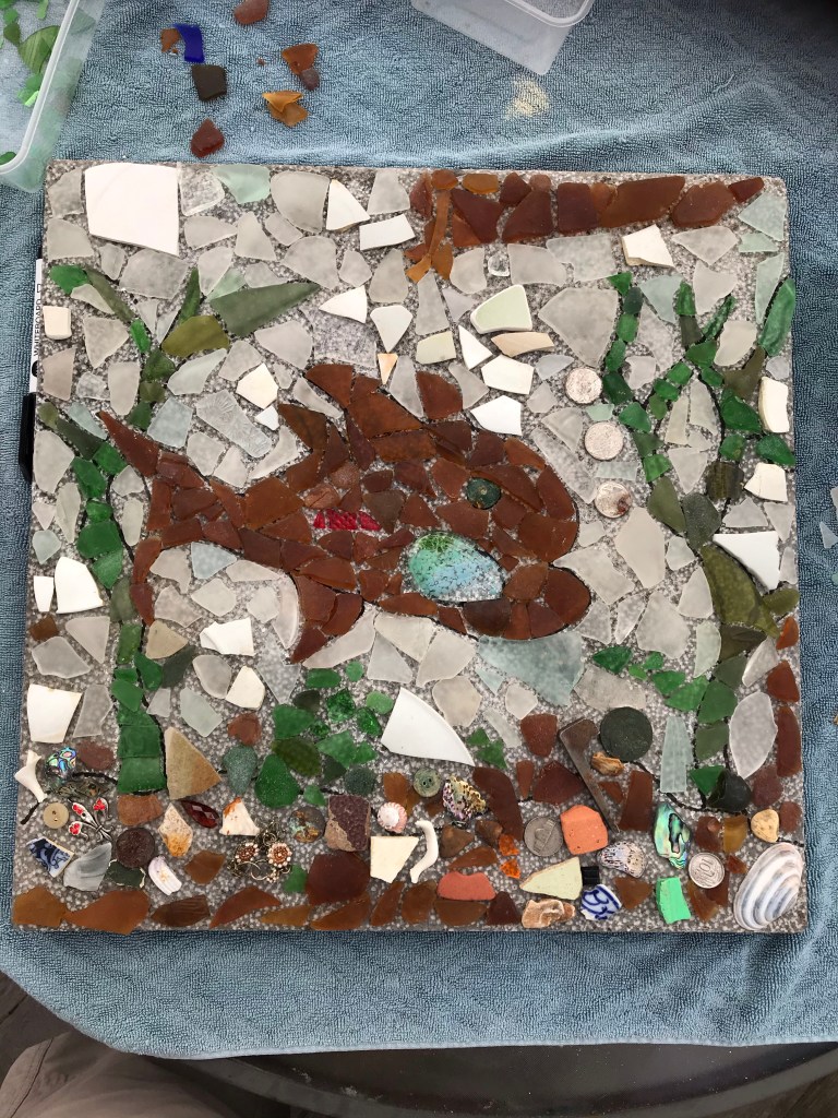 But now I’ve got a big jar of ‘stuff’ that’s accumulating. What to do?? Mosaic!!! This masterpiece will live out by the BBQ so I have a place to set things.