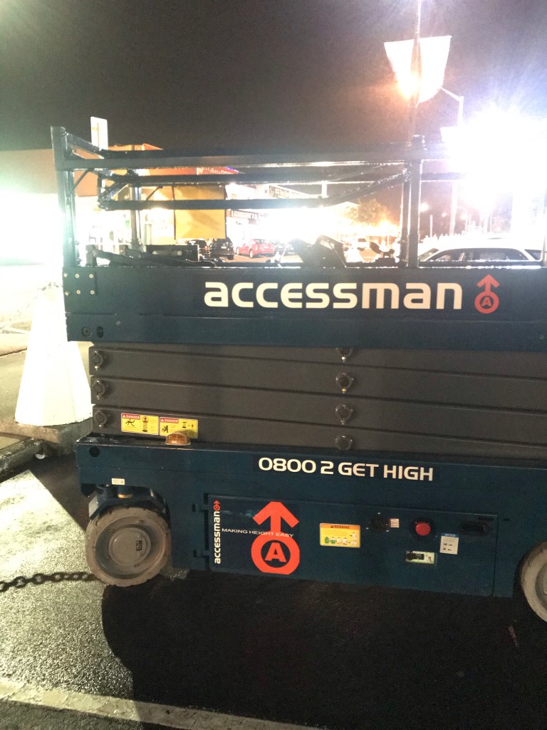 This lift is owned by Accessman, who rent out all manner of tall things. I like their phone number, and even more their willingness to stake their whole marketing effort on a gag.