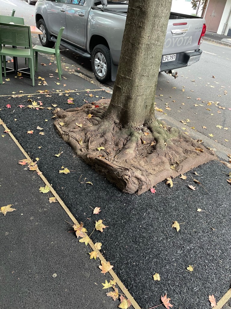 The sweetgum trees on this street were strangled by their previous metal frames. These new flexible porous mats should let them breathe a little better.